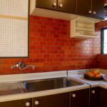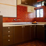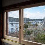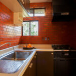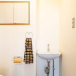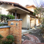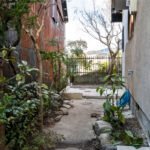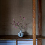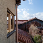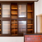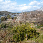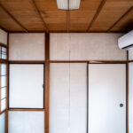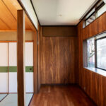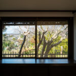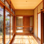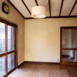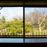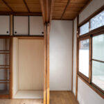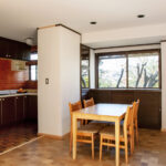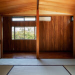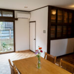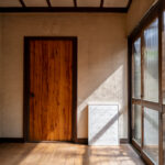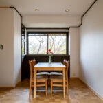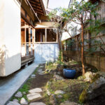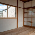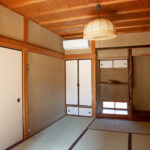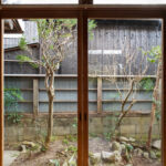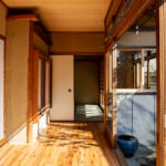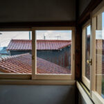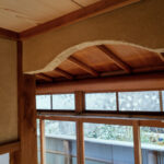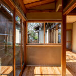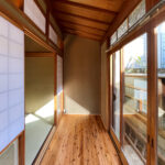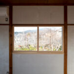 修学院の古民家は、静かで自然豊かな住宅街に在り、修学院離宮の目と鼻の先にひっそりと佇んでいる。このエリアは散歩好きにはたまらないであろう。ミッドセンチュリーな空気を纏うキッチンは赤煉瓦のタイル張り。食器棚のガラス戸が今は無き時代の面影を残している。リビングと西側の和室は船底天井。「なんて表情の豊かな家なのだ」と思う。縁側の床材は杉板で、木目の凹凸による足心地がとても良い。通常よりも幅の広い縁側は日当たりも良く、読書や在宅ワークに適している。なんといっても、北側の畑の景色と京北の山並みが、修学院の古民家の最大の魅力である。